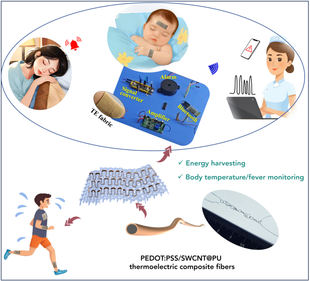 针对这一挑战,该课题组提出了一种兼具高热电性能、机械稳定性与可织性的聚(3,4-乙烯二氧噻吩),聚苯乙烯磺酸盐/单壁碳纳米管@聚氨酯(PEDOT:PSS/SWCNT@PU)复合热电纤维,进而构筑了柔性热电织物,并探讨了其智能体温检测与报警系统应用场景。通过简便、安全的冻融诱导凝胶化与湿法纺丝相结合,实现了连续可纺、结构均一的高性能复合热电纤维。SWCNT构建的导电网络与酸处理协同提升了电导率与功率因子。PU外层赋予材料优异的柔韧性、耐洗性、耐低温性和长期稳定性。在此基础上制备的32个p-型纤维集成热电织物,在小温差下即可产生稳定而灵敏的电信号,50 K温差时实现了60.1 μW cm-2的高功率密度,并在机械循环与环境应力下保持超过95%的性能。利用该织物开发的自供能体温监测与发烧预警系统,可在2–5秒内响应体温变化,对不同体温低等级(正常/低热/高热/过热)的识别准确率达94%,并可实现远程传输与智能报警,在儿童看护、健康监测和运动管理具有广阔的应用前景。